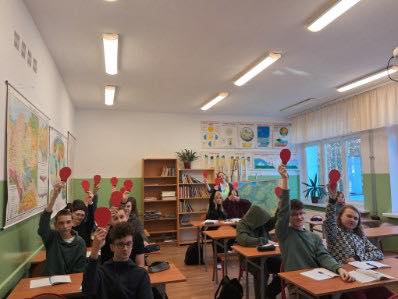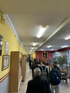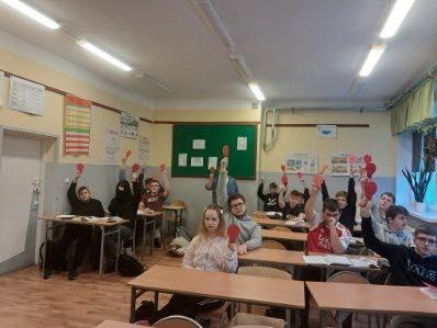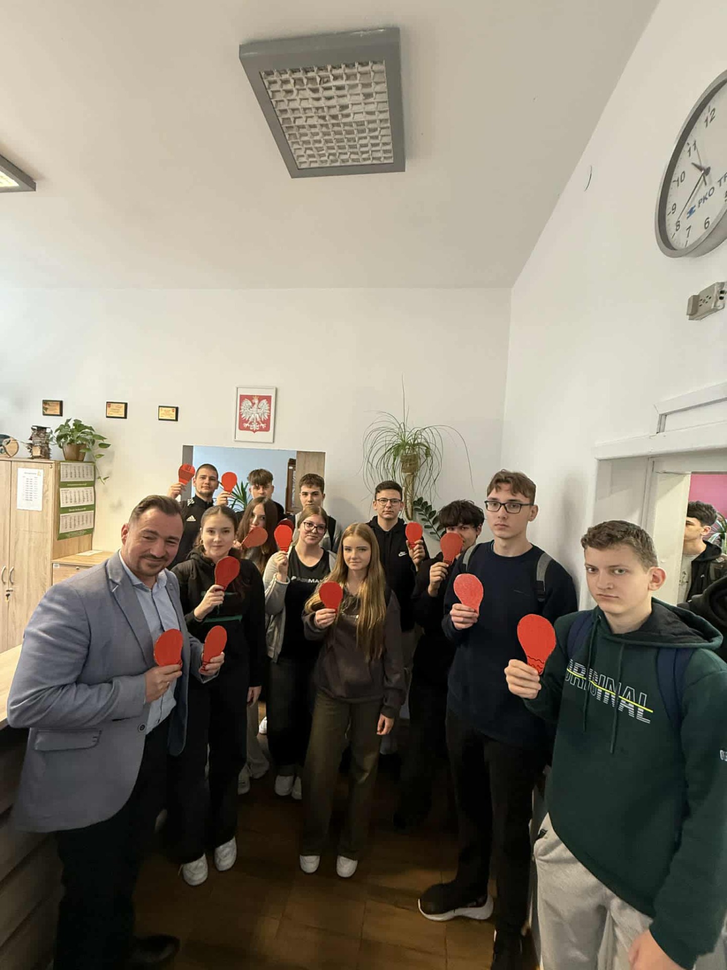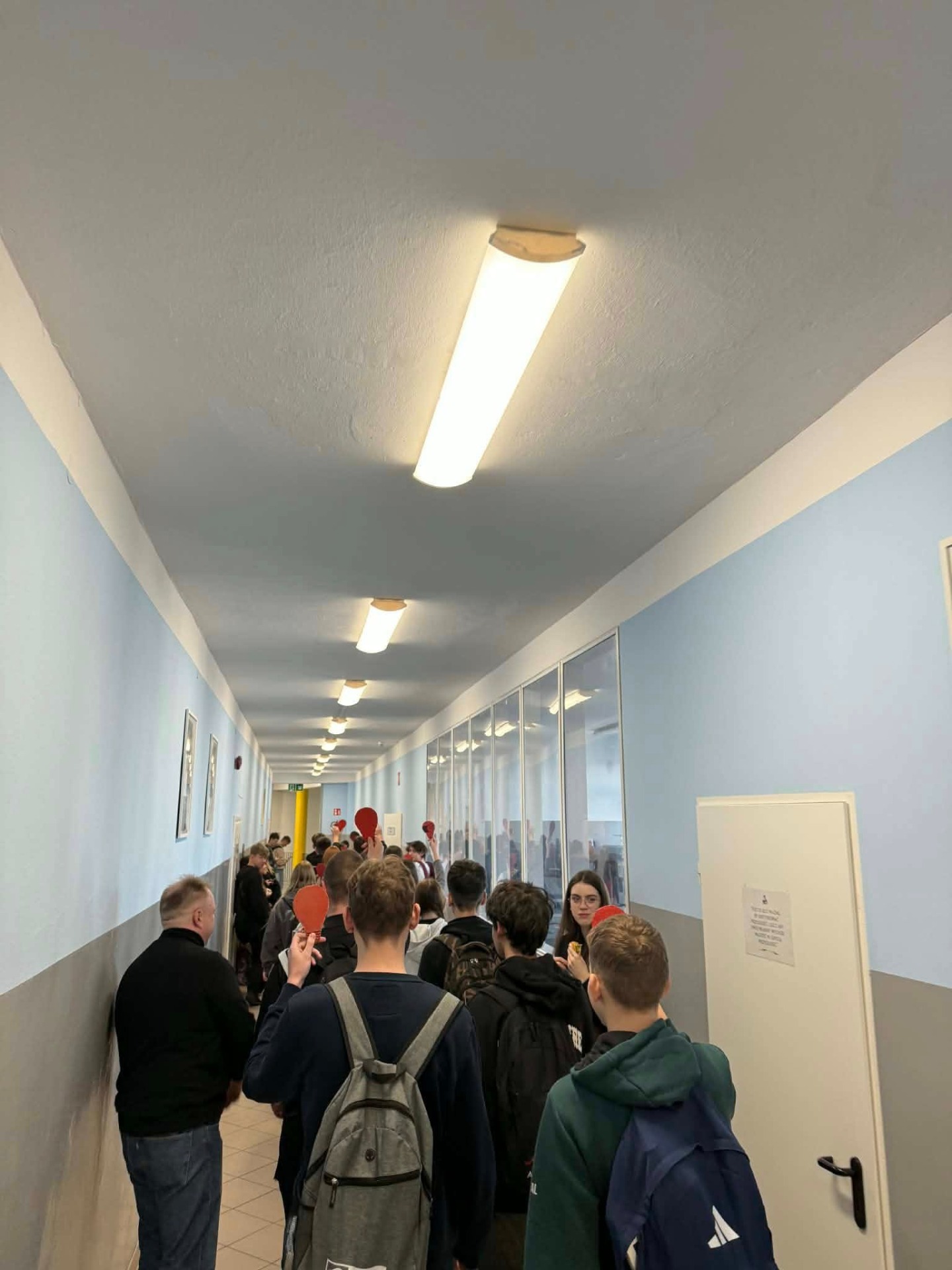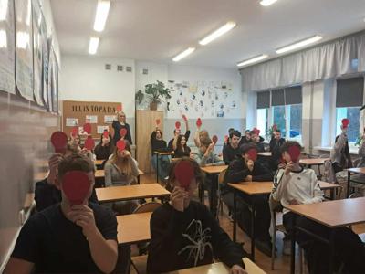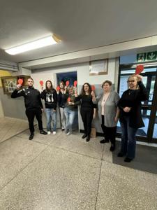 Manifest Młodzieży wobec przemocy, podczas długiej przerwy, z wykorzystaniem przygotowanych symboli – czerwonych żarówek.